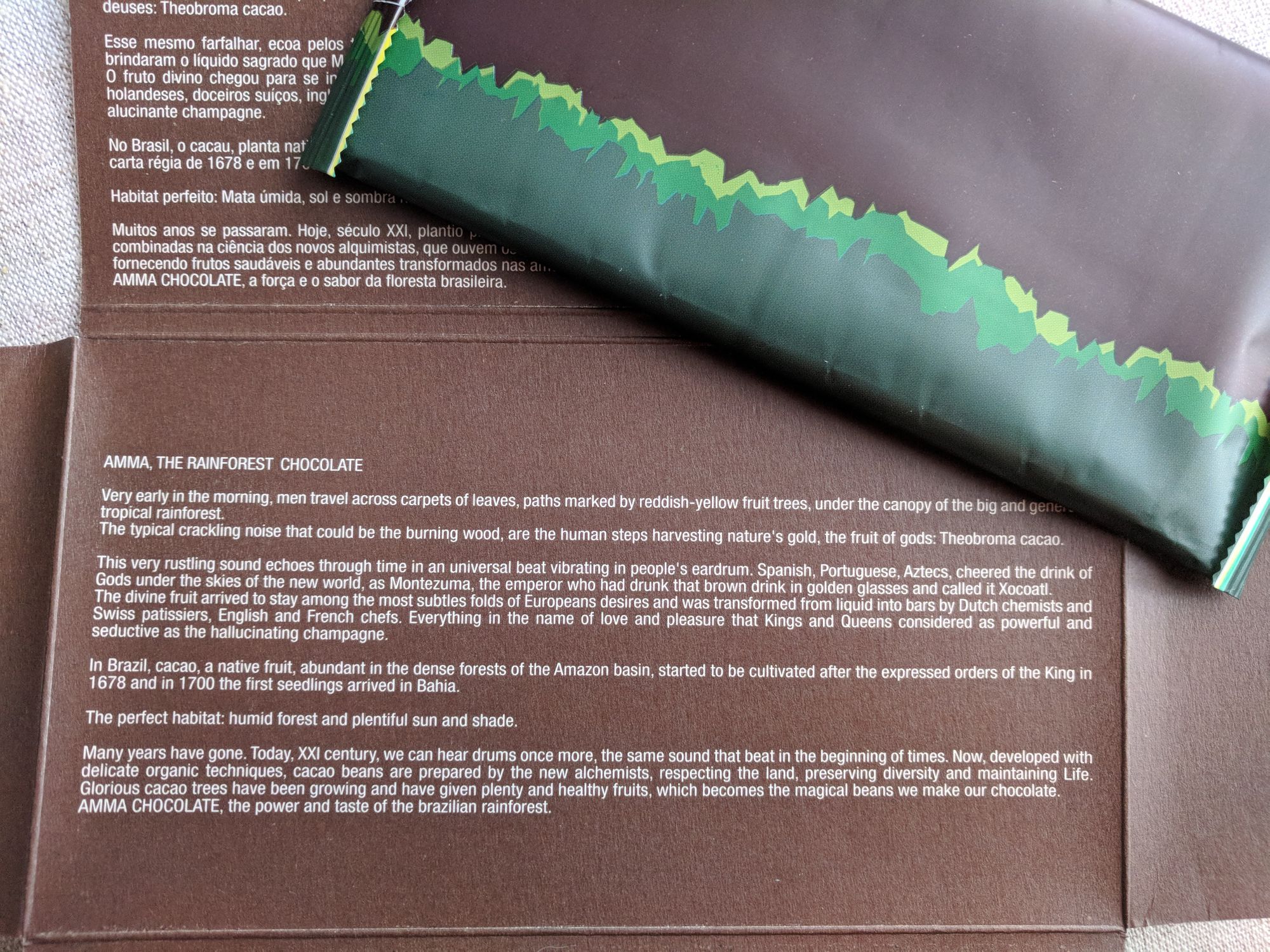 Brazilian bar from Brazilian cocoa beans. Purchased, if my memory serves me right, in Vienna. The packaging is nice on the outside, a little upset me »